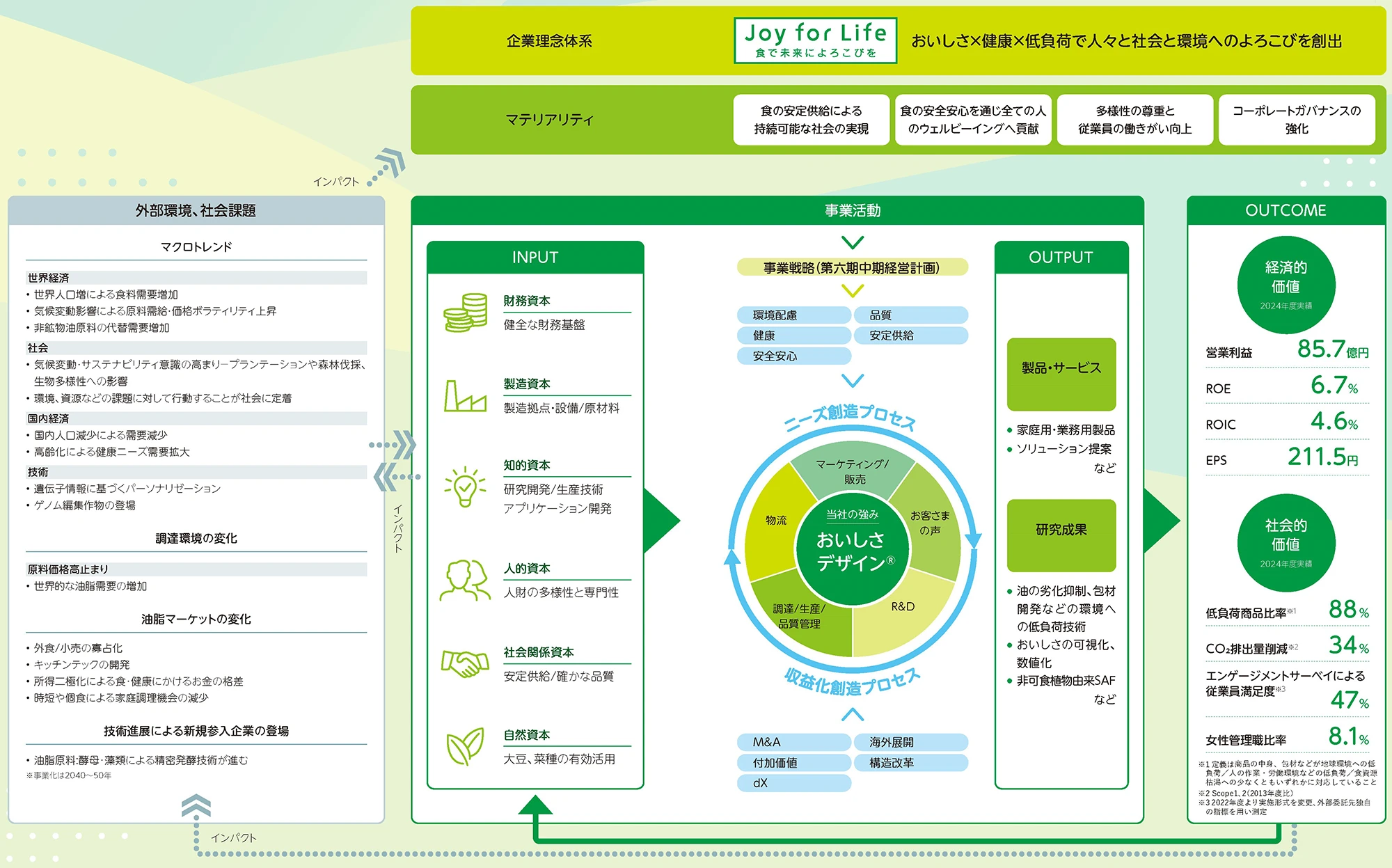 We believe that by continuing to develop this value creation model, we will be able to create joy for people, society, and the environment, contribute to solving social issues, and realize the future that our corporate philosophy aims for: "Joy for Life-Bringing joy to the future by food."